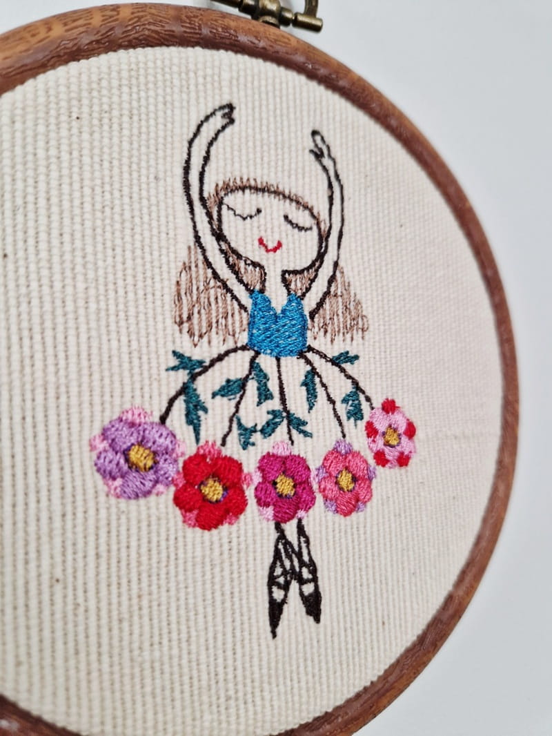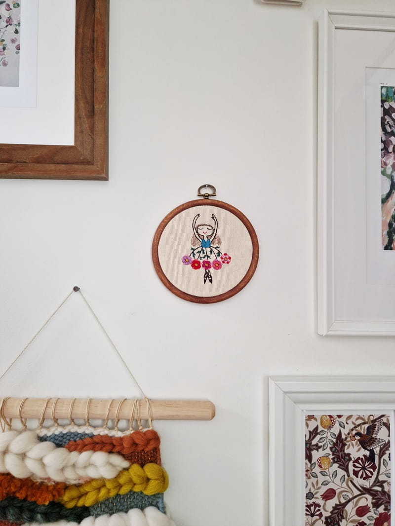 Uroczy haft z baletnicą w kwiecistej spódnicy wprowadza ciepły i trochę bajkowy akcent do wnętrza.