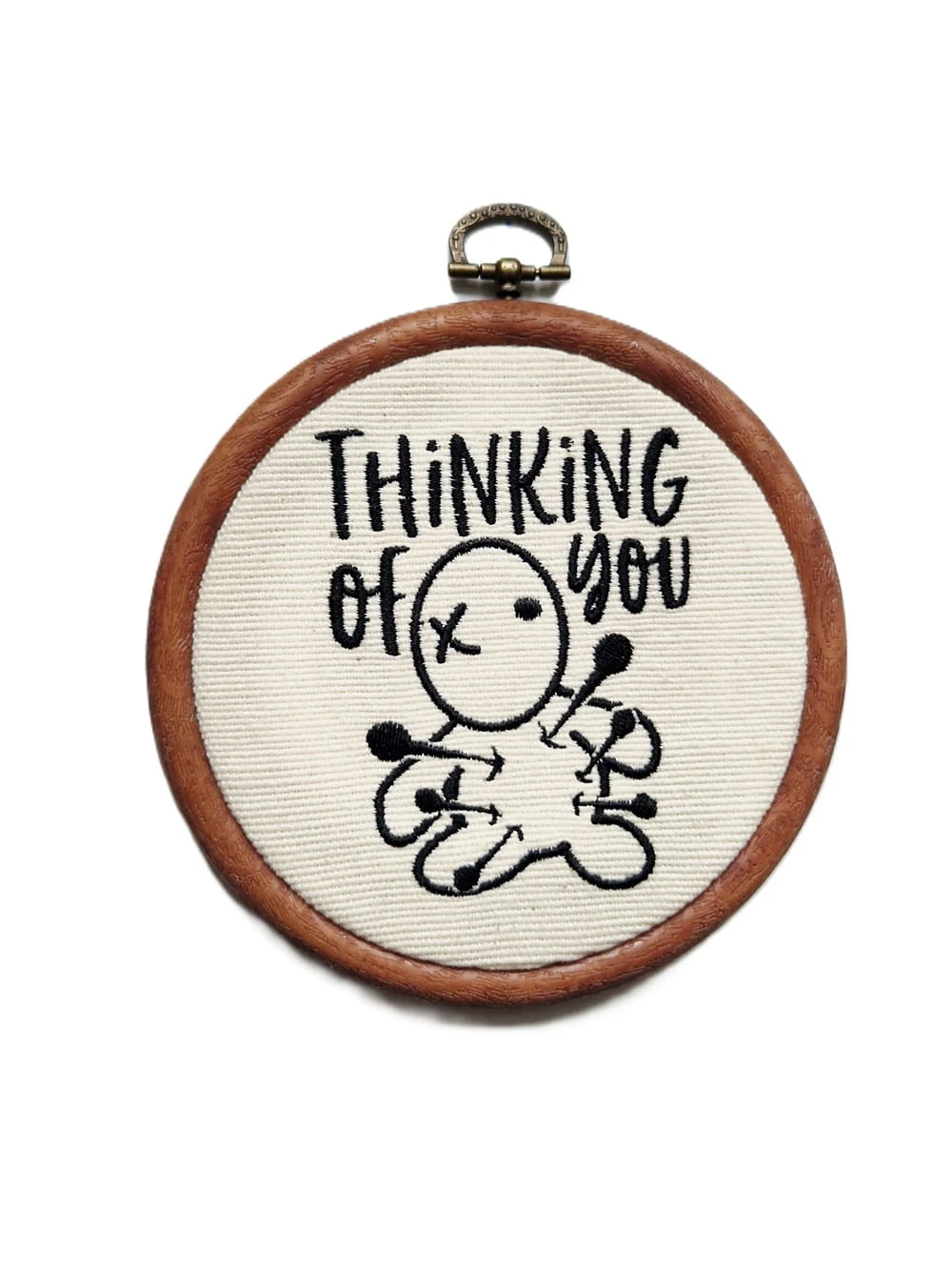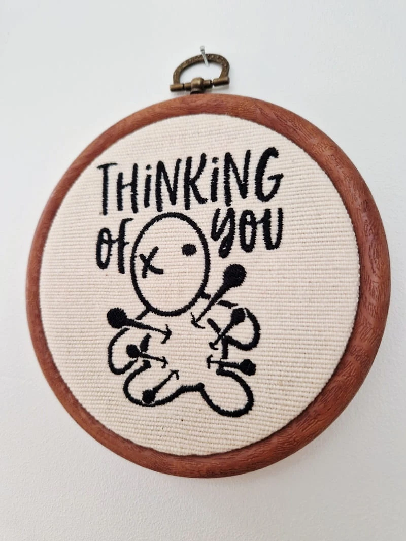 Szukasz prezentu z dla osoby ceniącej czarny humor? Ten tamborek z haftowaną laleczką Voodoo to idealny, ironiczny sposób na powiedzenie komuś, że o nim myślisz.