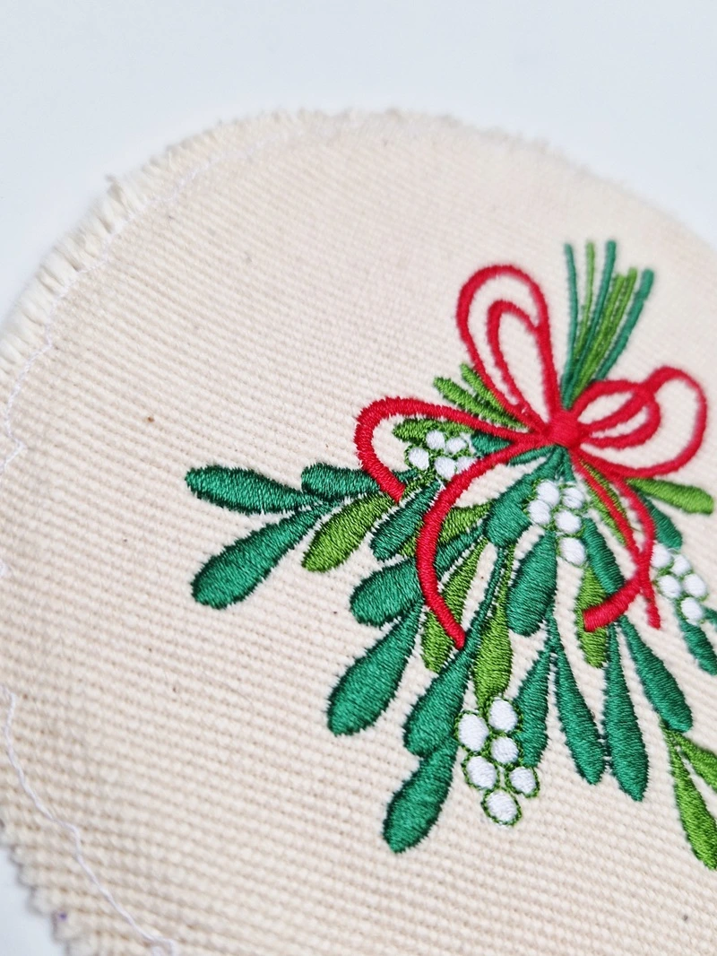 Haftowana jemioła z czerwoną kokardą sprawdzi się idealnie jako zimowa i świąteczna dekoracja.