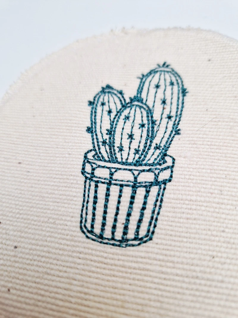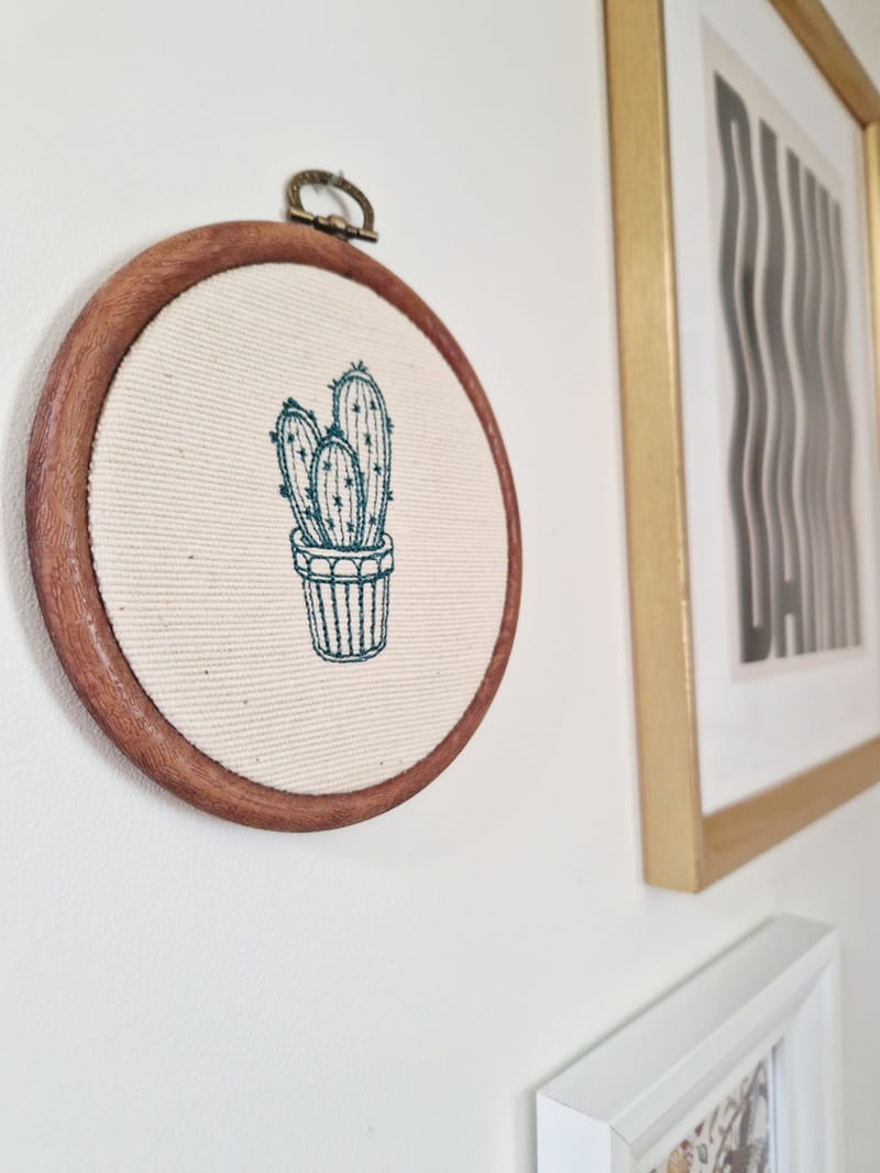 Minimalistyczny haftowany kaktus w doniczce to świetna ozdoba dla miłośników domowych roślin (tzw. urban jungle). Świetnie uzupełni ścienną galerię z motywami roślinnymi i zwierzęcymi.
