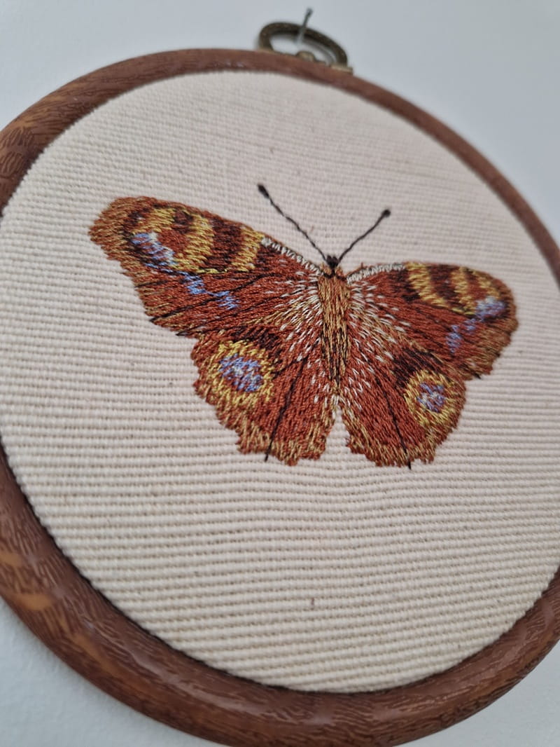 Gęsty haft nadaje motylowi efekt trójwymiarowości i puszystej tekstury.