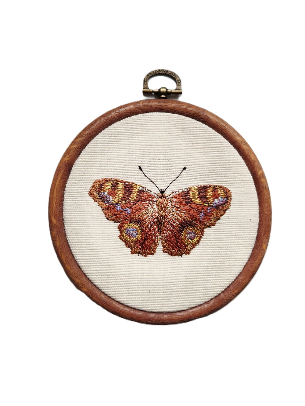 Realistycznie odwzorowany, haftowany motyl pawik z bogato zdobionymi skrzydłami w odcieniach brązu, złota i fioletu to doskonały dodatek dla osób pasjonujących się botaniką i ogrodnictwem.