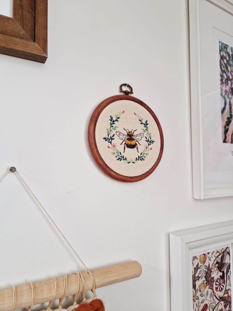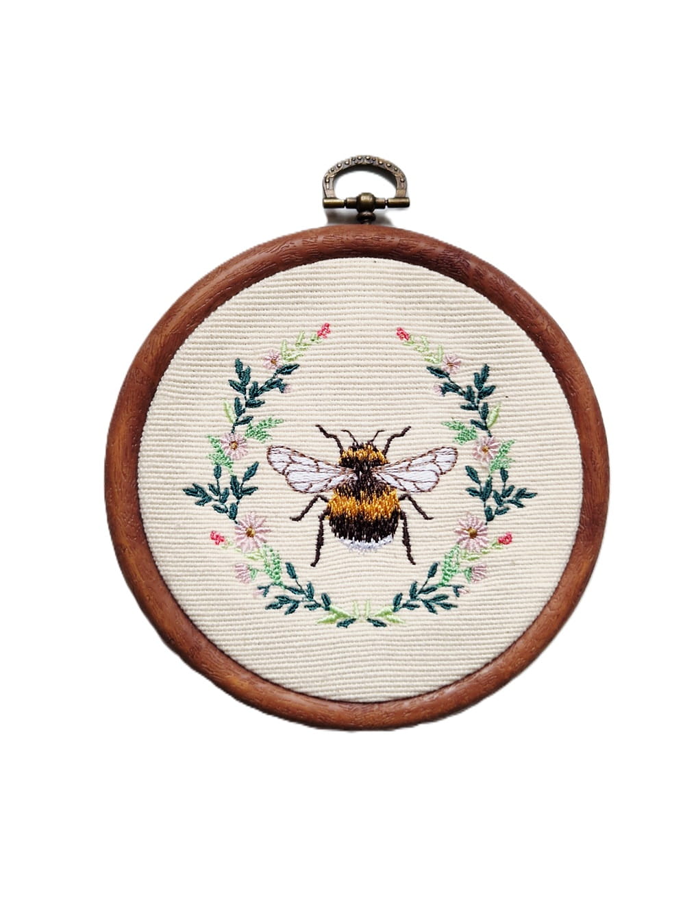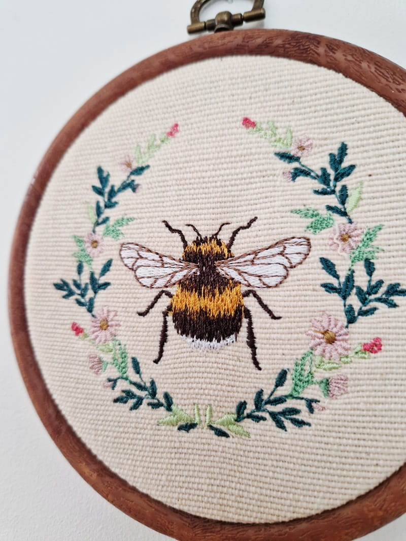 Haftowany trzmiel w roślinnym wianuszku