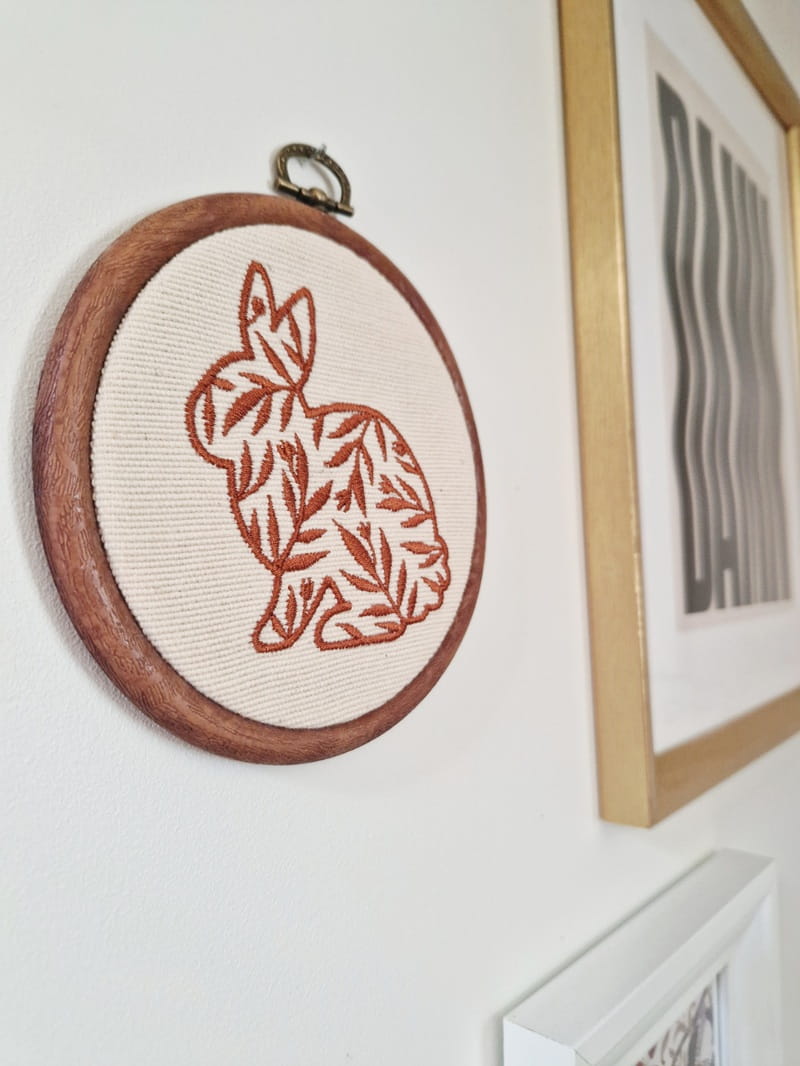 Haftowany zając sprawdzi się idealnie jako wiosenna lub wielkanocna dekoracja, choć jest na tyle uniwersalny, że może zdobić mieszkanie przez cały rok.