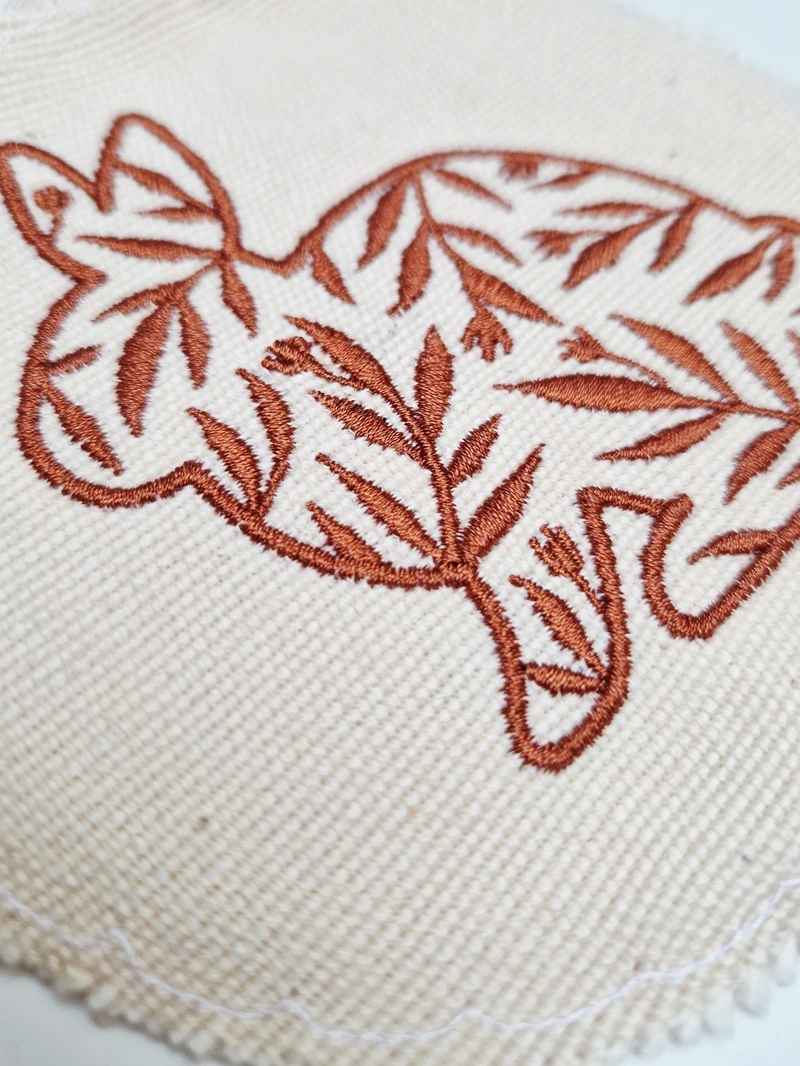 Haft maszynowy na grubej tkaninie bawełnianej, naturalnej i niebarwionej. Na krawędziach materiał może się nico strzępić. Nie martw się - jest zabezpieczony (obrębiony na maszynie).