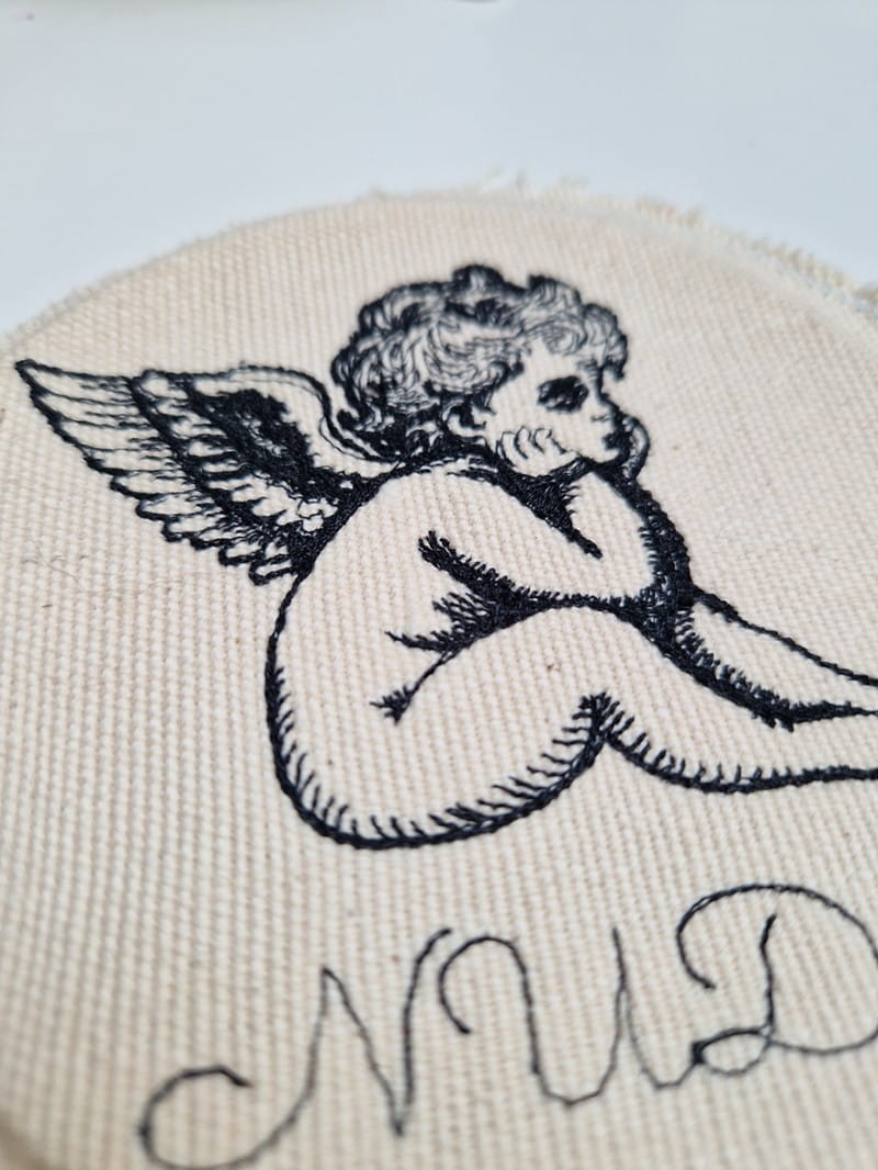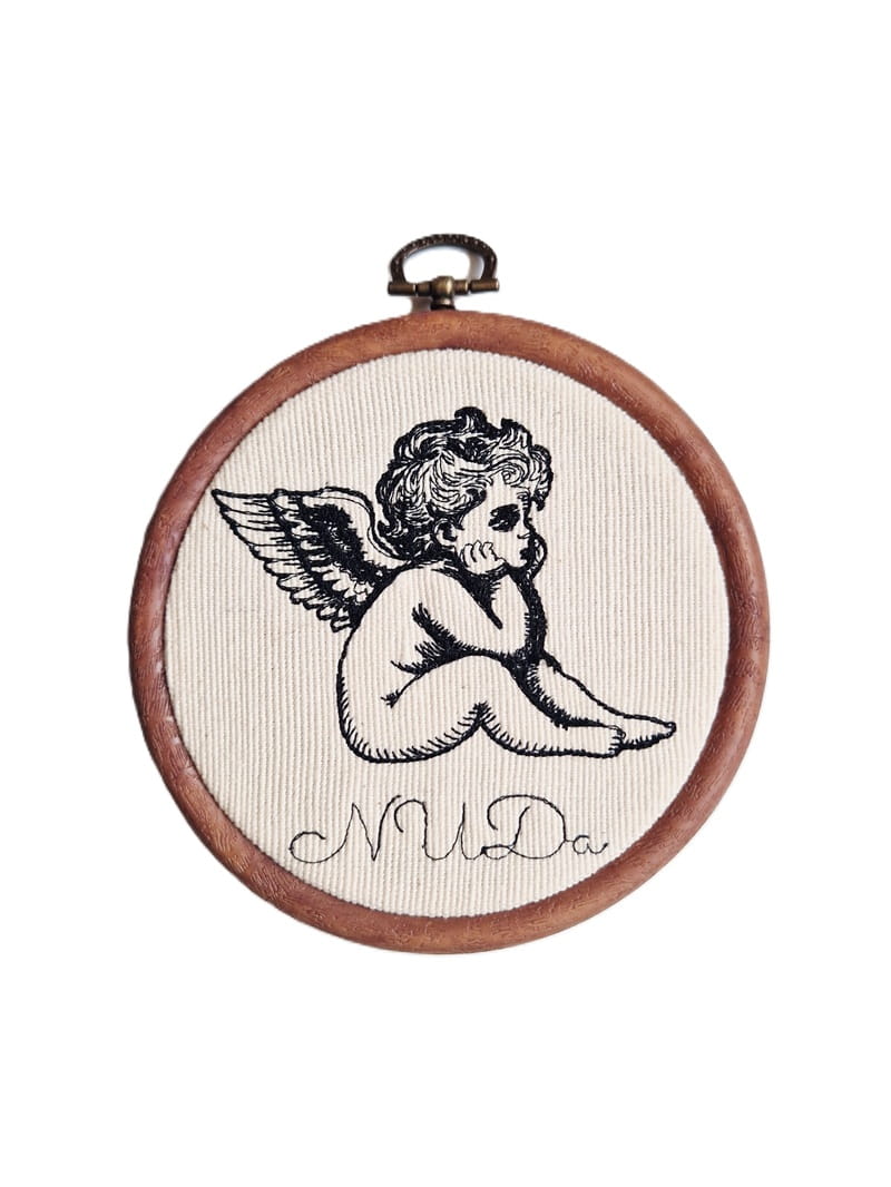 Haft przedstawia klasycznego aniołka (cherubinka) i przypomina rycinę lub stary szkic (linia i wypełnienie dają efekt światłocienia, szczególnie widoczny na skrzydłach i włosach).