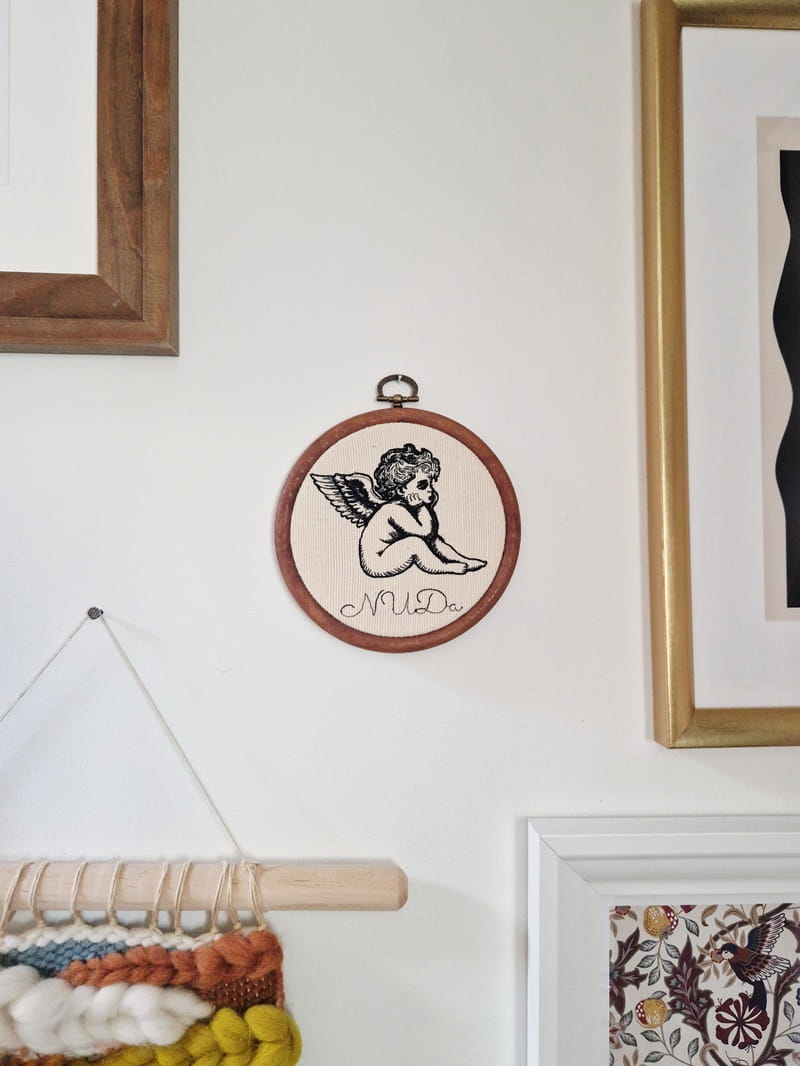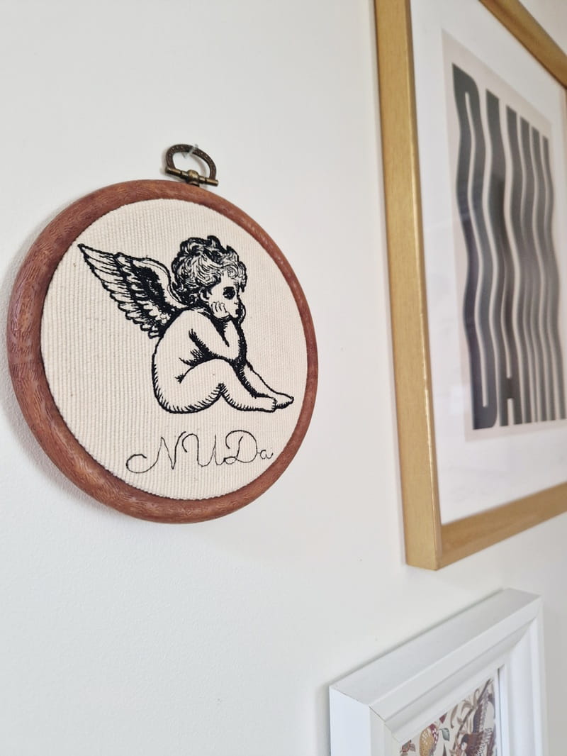Do haftowanej ozdoby dokup tamborek (ramkę). Bardzo łatwo go otworzysz, aby wymienić aniołka na inny haft.