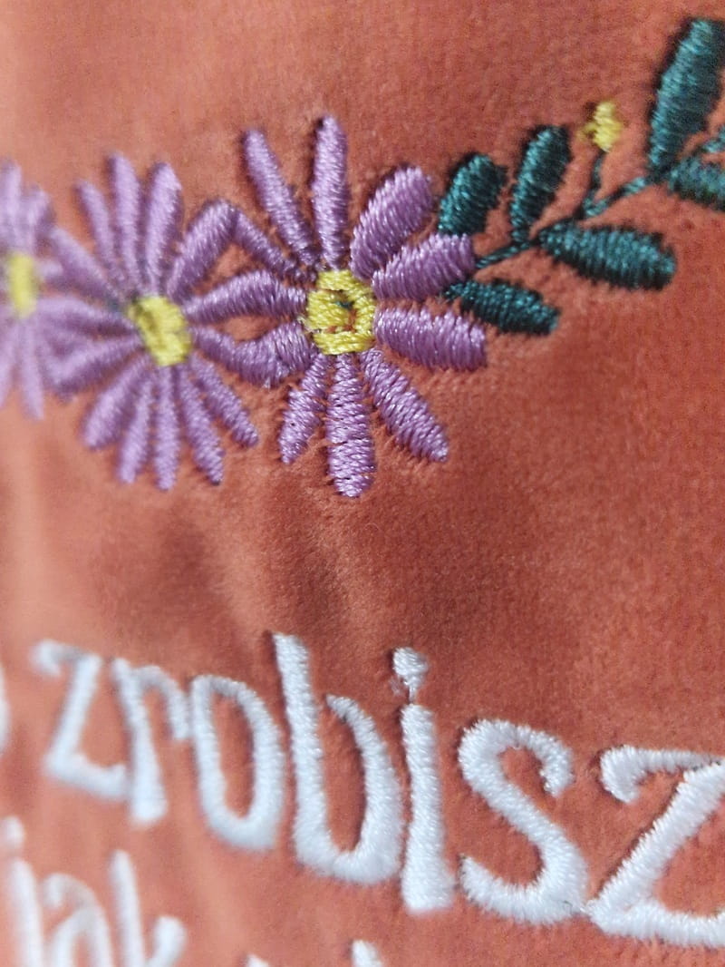 - Haft maszynowy na materiale welurowym, z tyłu materiał bawełniany (mają certfikat Oeko-tex)