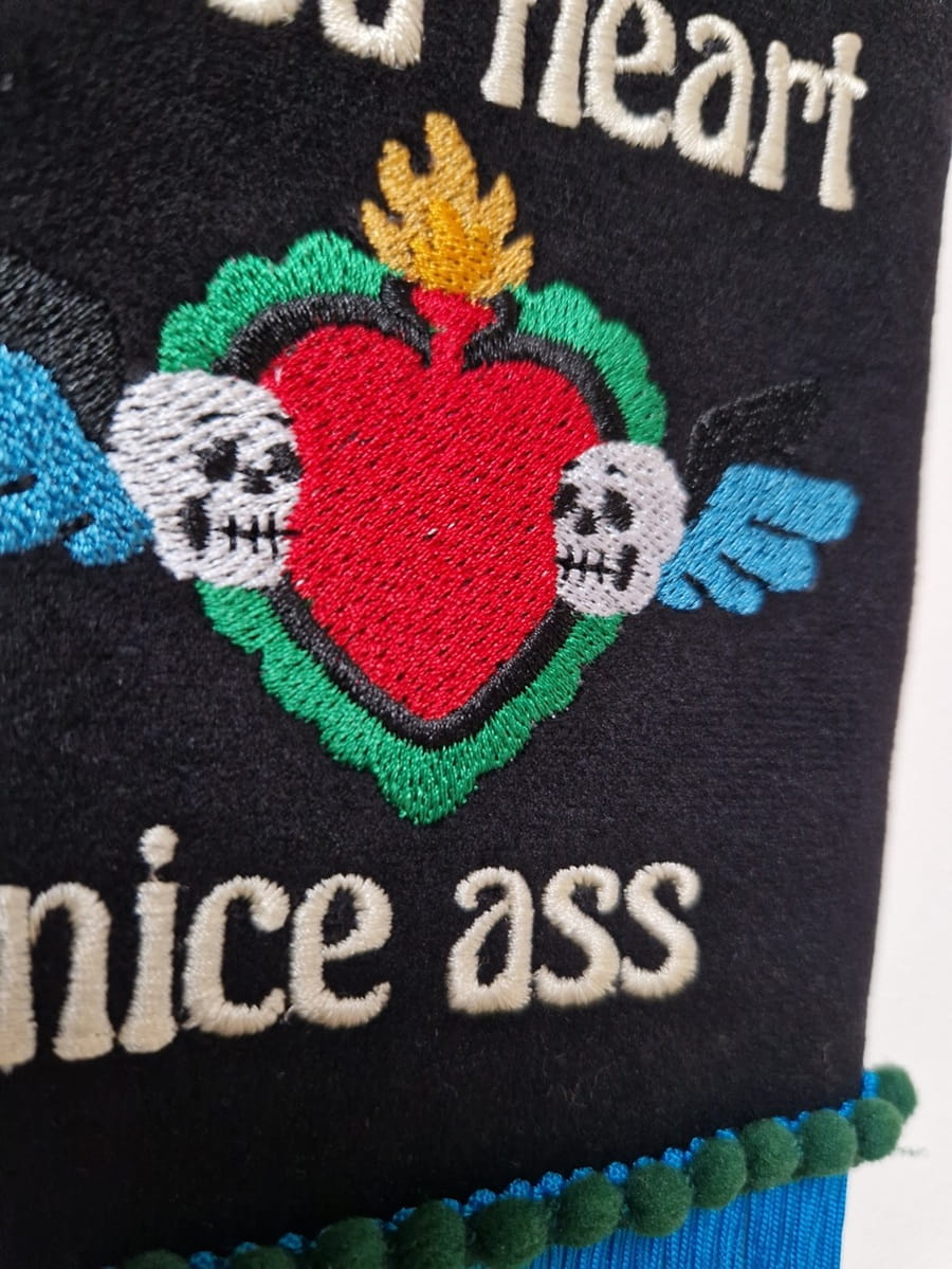 Haft maszynowy na materiale welurowym, z tyłu materiał bawełniany (mają certfikat Oeko-tex)