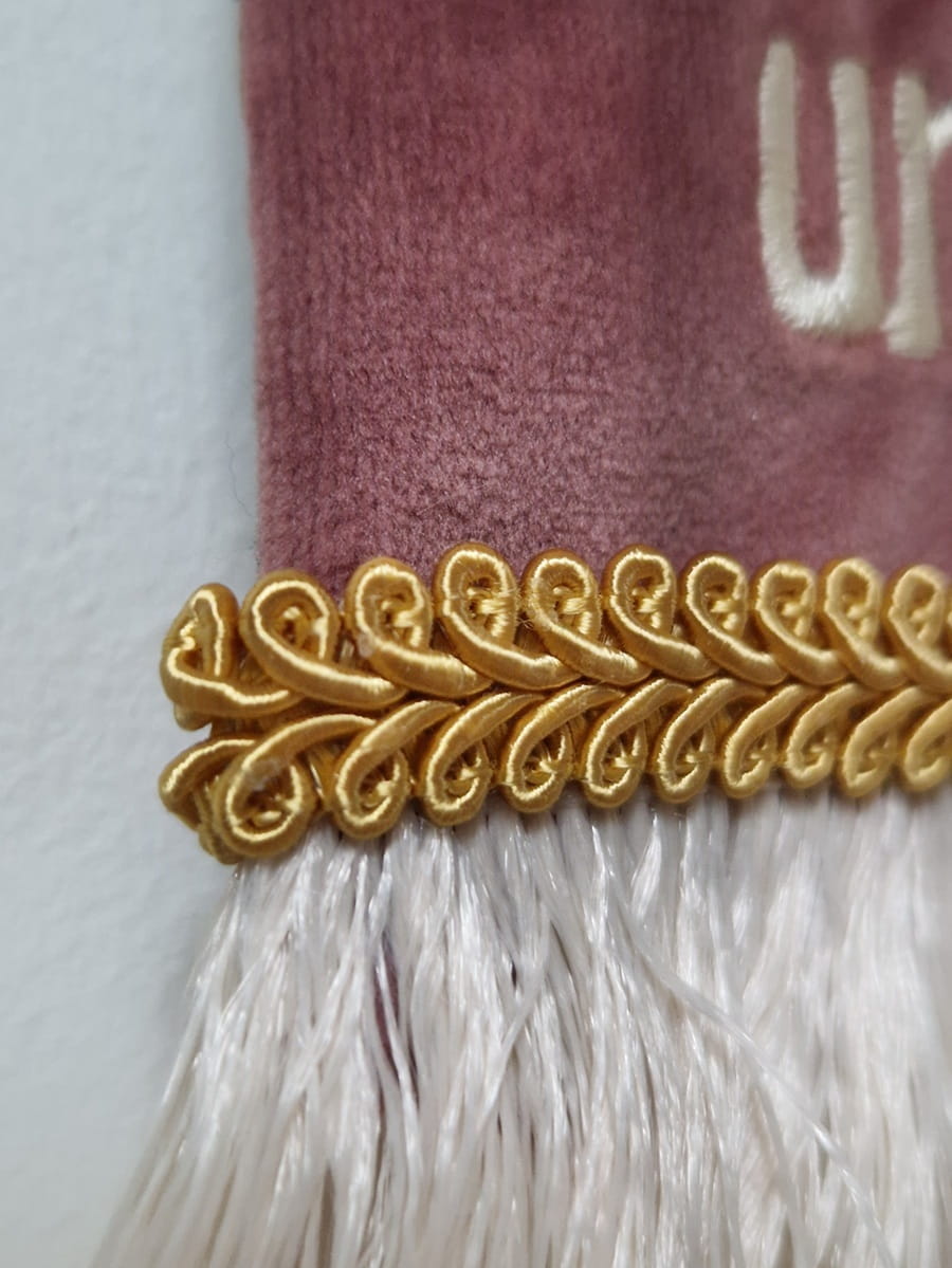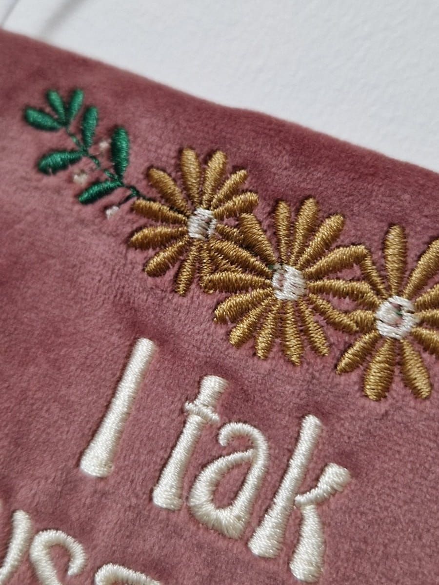 Haft maszynowy na materiale welurowym, z tyłu materiał bawełniany (mają certfikat Oeko-tex)
