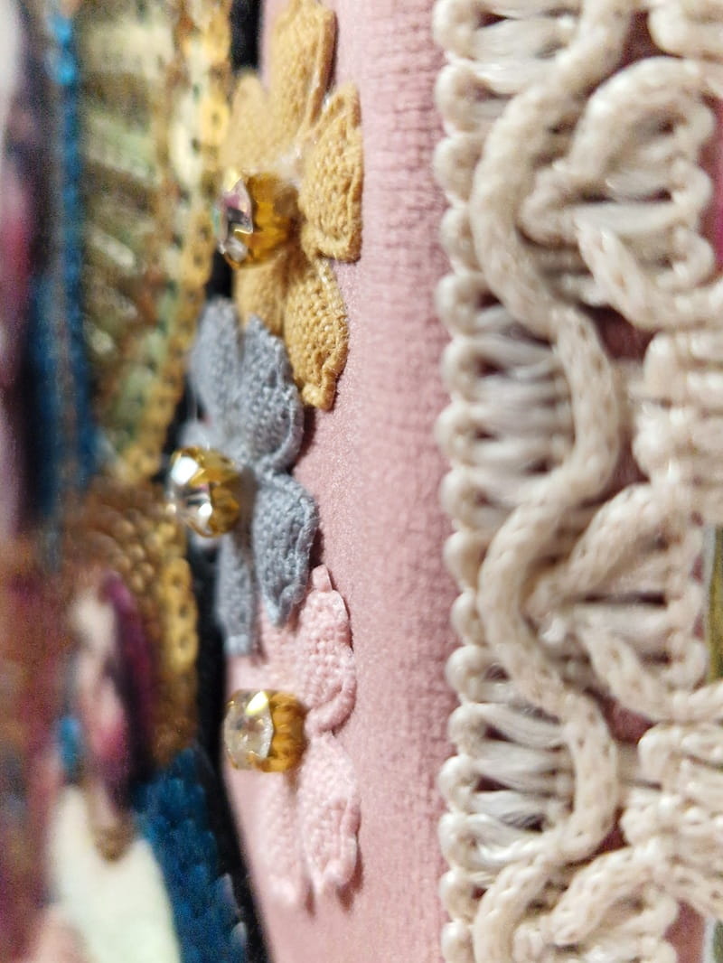 - Aplikacja z cekinów, materiałowe kwiatki z kryształkami; uważaj: drobne elementy można oderwać/odkleić - dzieci mogą się nimi zakrztusić