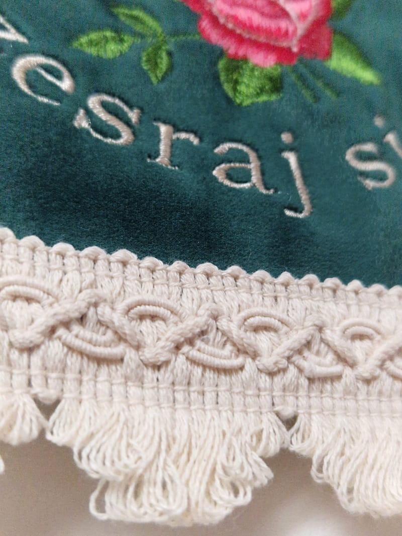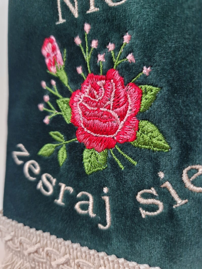 - Haft maszynowy na materiale welurowym, z tyłu materiał bawełniany (mają certfikat Oeko-tex)
