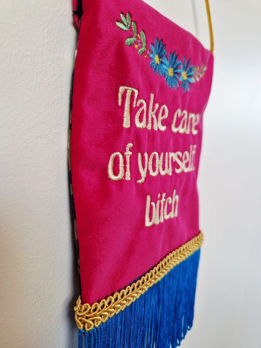 Proporczyk z napisem Take care of yourself, bitch, czyli: Dbaj o siebie, kochana.